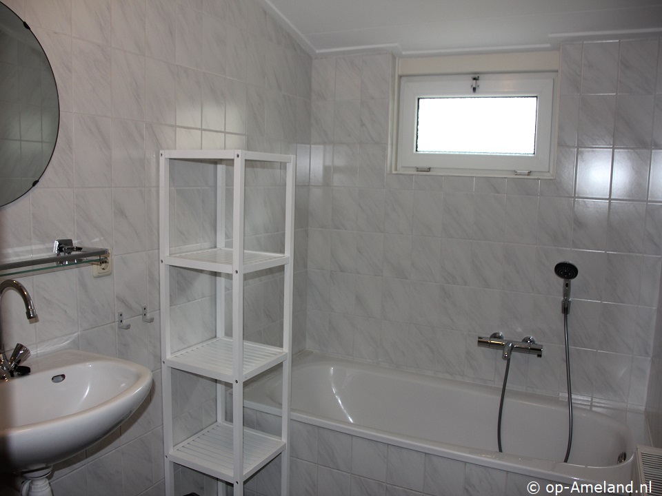 Badezimmer mit Badewanne und Dusche. Separate Toilette.